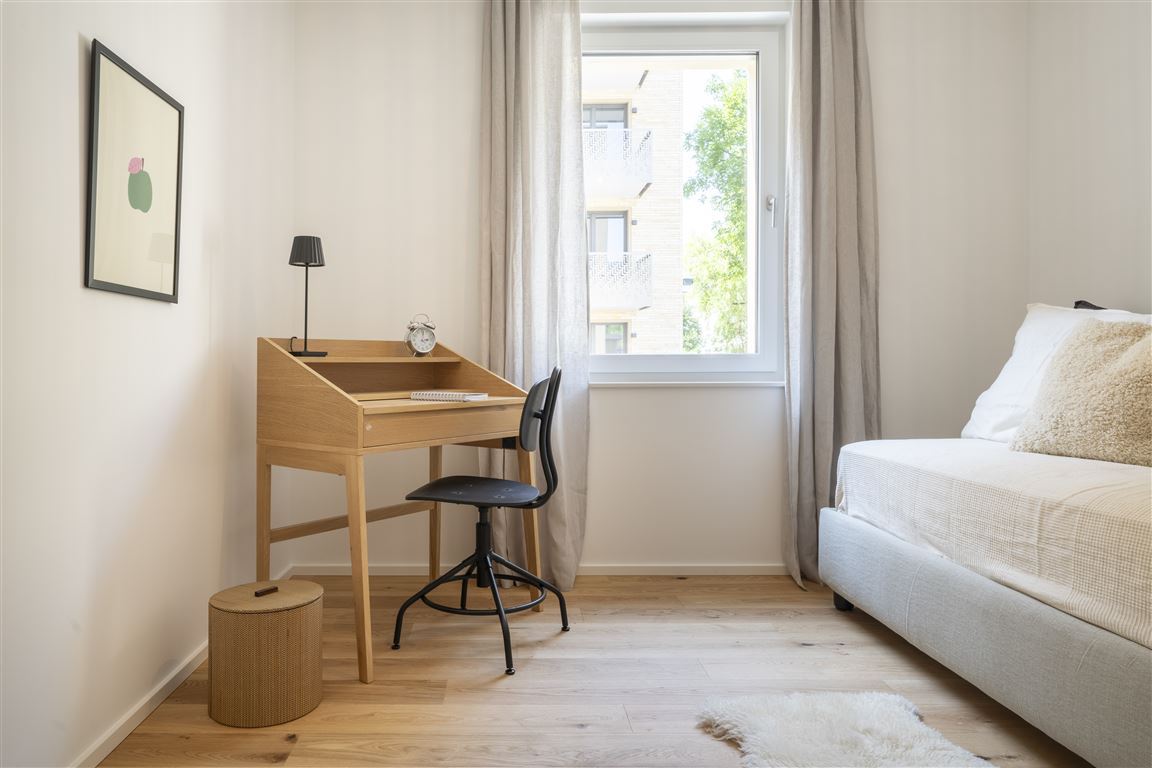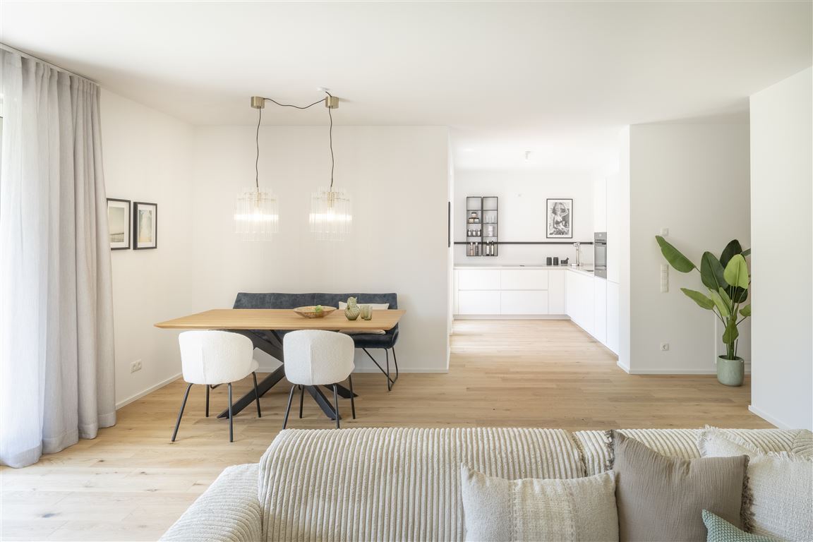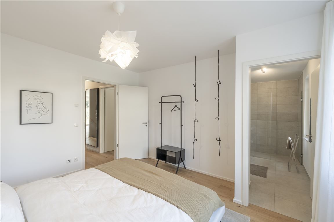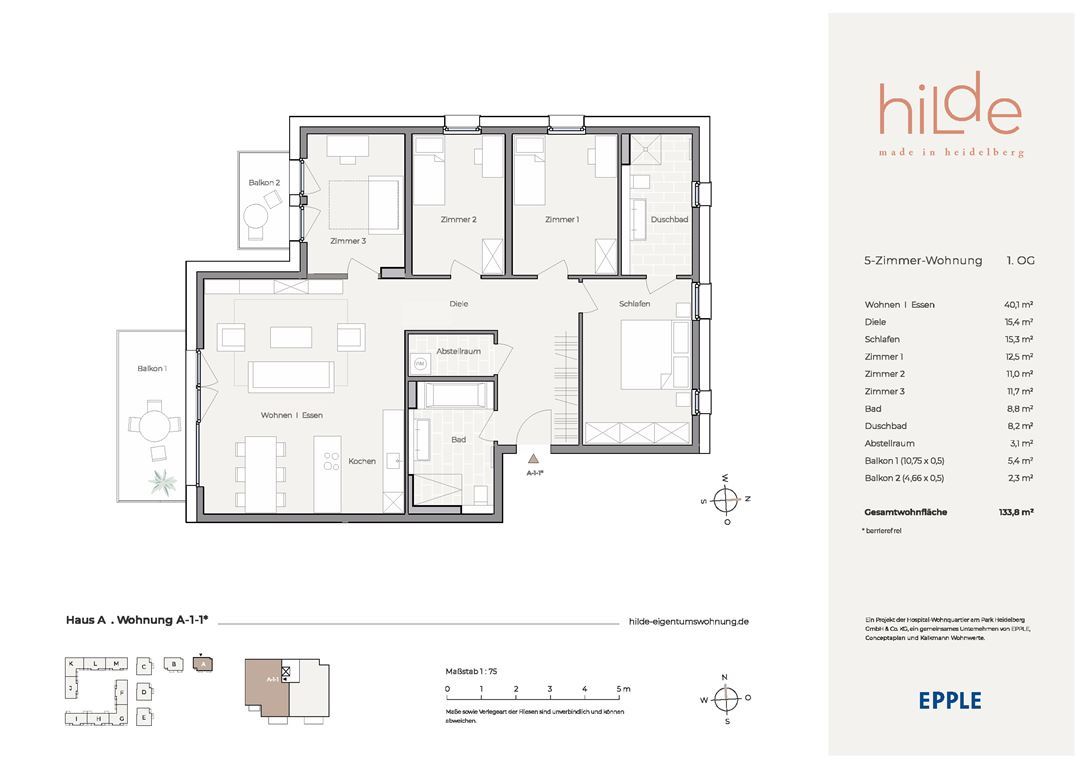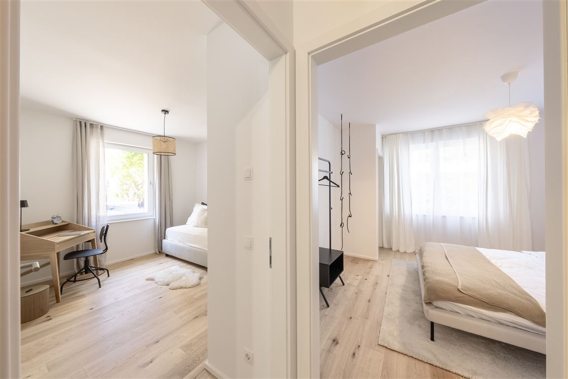 Die moderne 5-Zimmer-Wohnung befindet sich im 1. Obergeschoss eines Mehrfamilienhauses mit nur 10 Parteien. Der Bereich Wohnen / Kochen / Essen ist offen gestaltet. Dort gelangen Sie zu dem ersten Südbalkon, der direkten Ausblick in die grüne Quartiersmitte, den Hospital-Park, bietet. Den zweiten Balkon erreichen Sie über eines der Schlafzimmer. An das (Eltern-) Schlafzimmer schließt sich ein Ensuite-Tageslicht-Duschbad an. Die weiteren Zimmer sind vielseitig nutzbar – als Kinderzimmer, Gästezimmer oder Home Office. Das zweite Badezimmer ist mit einer Wanne und einer Dusche ausgestattet. Die Waschmaschine findet im Abstellraum Platz.