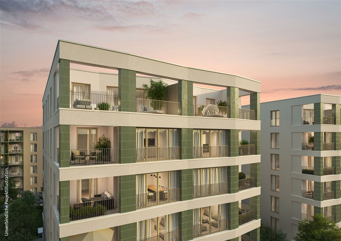 WOHNEN MIT PERSPEKTIVE.Die 2-Zimmer-Eigentumswohnung ist mit rund 57 m² Wohnfläche ausgestattet. Der rund 29 m² Wohn- und Essbereich ist lichtdurchflutet gestaltet und schließt sich an die offene Küche an. Von hier aus gelangen Sie auf Ihre private Ost-Loggia, von der Sie den unverbaubaren Blick auf den rund 7.000 m² großen Quartierspark genießen können. Darüber hinaus verfügt die Wohnung über ein geräumiges Schlafzimmer sowie einen Abstellraum mit Waschmaschinenanschluss. Das Duschbad beinhaltet eine bodengleich geflieste Dusche.