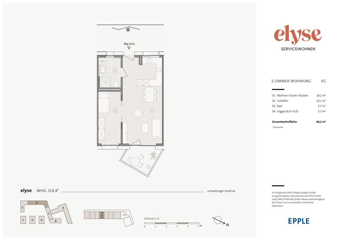 Die 2-Zimmer-Eigentumswohnung ist mit einer rund 48 m² Wohnfläche ausgestattet. Der Wohn- und Essbereich ist offen gestaltet und beinhaltet ebenso eine offene Küche. Von hier aus gelangen Sie auf Ihre private Loggia mit Ausrichtung in den grünen Innenhof. Das Schlafzimmer ist ebenfalls zum ruhigen Innenhof ausgerichtet. Das Tageslicht-Bad ist mit einer bodengleich gefliesten Dusche ausgestattet. Hier findet auch die Waschmaschine Platz. Selbstverständlich ist die Wohnung barrierefrei gestaltet.