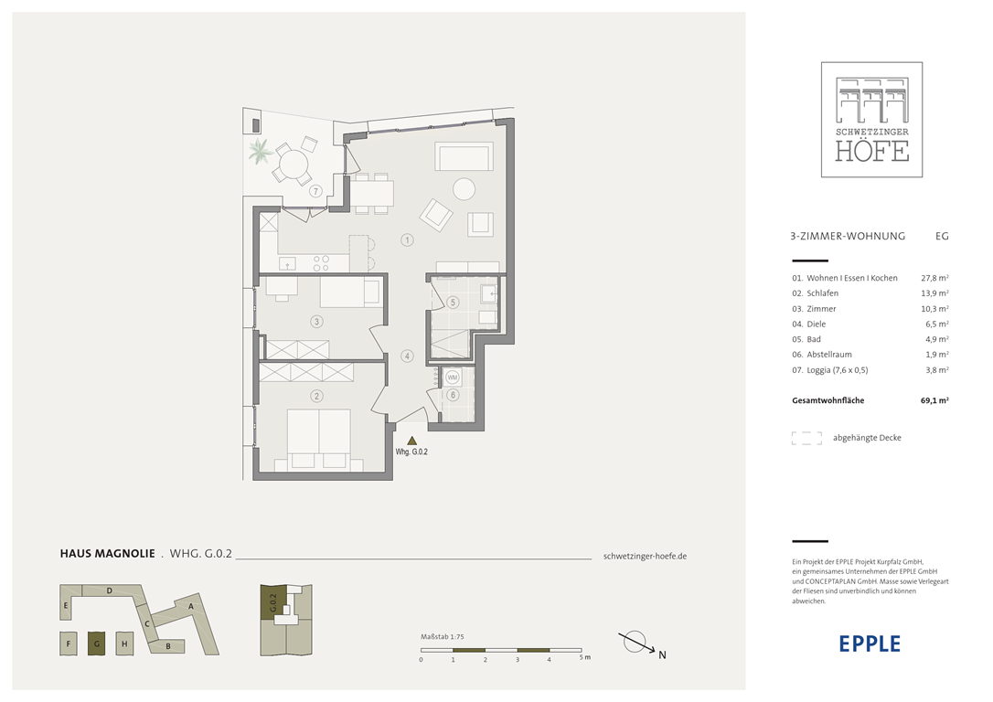 Die 3-Zimmer-Eigentumswohnung ist mit rund 69 m² Wohnfläche ausgestattet. Der rund 28 m² Wohn- und Essbereich ist offen gestaltet und schließt sich an die offene Küche an. Von hier aus gelangen Sie auf Ihre private Loggia, von der Sie den unverbaubaren Blick auf den rund 7.000 m² großen Quartierspark genießen können. Darüber hinaus verfügt die Wohnung über zwei weitere Zimmer, die als Schlaf- oder Gästezimmer sowie als Home Office genutzt werden können. Das Duschbad beinhaltet eine bodengleich geflieste Dusche. Praktische Staufläche bietet ein Abstellraum, wo auch die Waschmaschine ihren Anschluss hat.