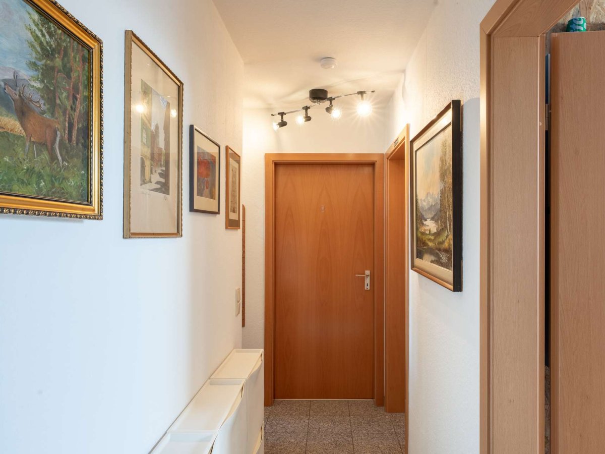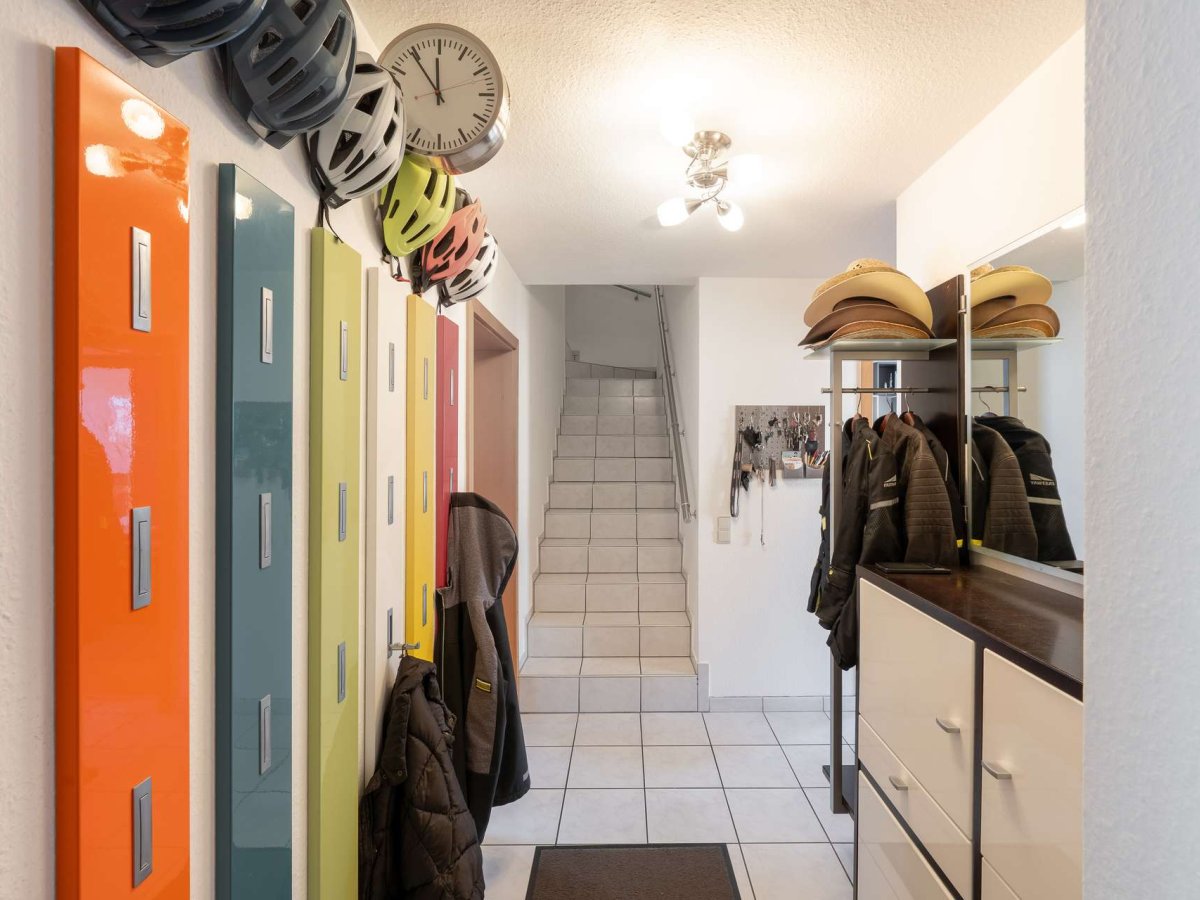 Auf der Eingangsetage befindet sich der Hauptwohnbereich mit einem großzügigen Wohnzimmer, das direkten Zugang zum sonnigen Süd-Balkon bietet. Eine abgeschlossene Küche, ein Tageslicht-Vollbad mit Doppelwaschtisch und Waschmaschinenanschluss, sowie ein separates Gäste-WC runden diese Etage harmonisch ab.