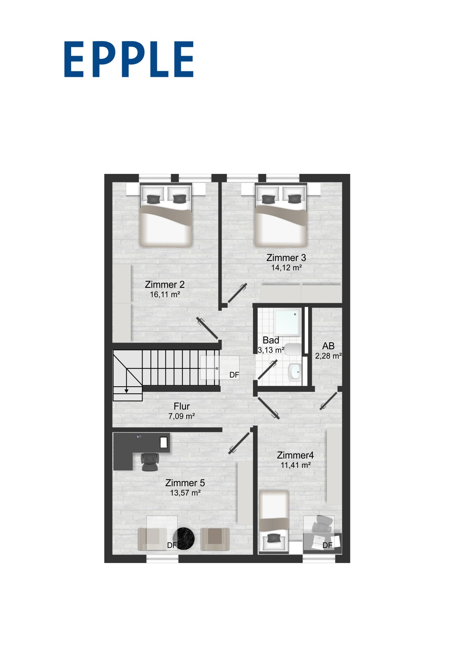 Auf der oberen Etage befinden sich vier gut geschnittene Schlafzimmer, die vielfältige Nutzungsmöglichkeiten bieten – ob als Kinder-, Arbeits- oder Gästezimmer. Eines der Zimmer verfügt über eine separate Ankleide oder einen praktischen Abstellraum. Zudem befindet sich auf dieser Ebene ein modernes Duschbad.