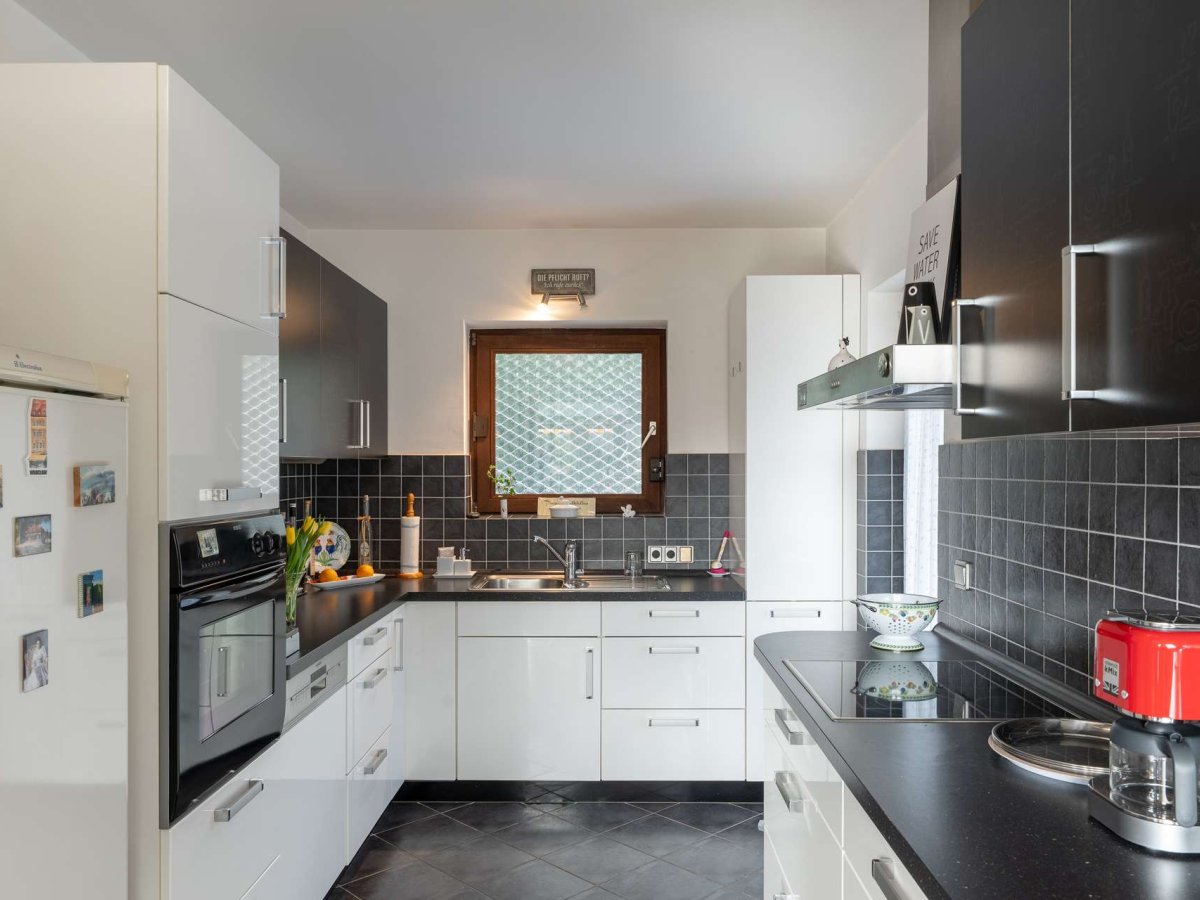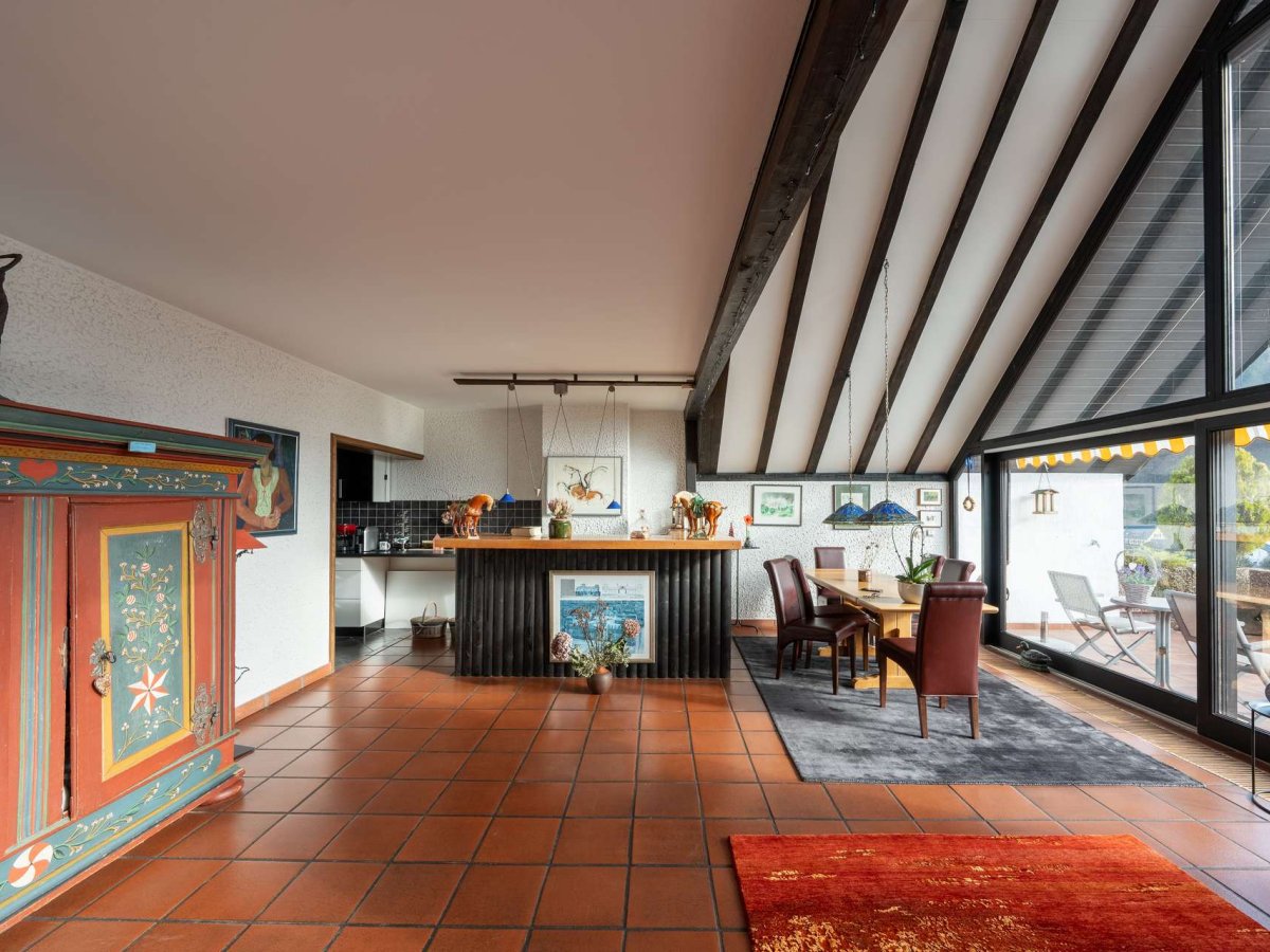 Die separate Küche ergänzt den vielseitig nutzbaren Grundriss und wird ergänzt durch die angrenzende Café-Bar. Große Fensterflächen durchfluten den Wohnraum mit Tageslicht und schaffen eine helle, freundliche Atmosphäre. Über eine Holz-Wendeltreppe gelangen Sie in zwei Studiozimmer, die zusätzlichen Wohn- oder Arbeitsraum bieten. Die Räume sind clever dimensioniert und schaffen Rückzugsorte mit klarer, offener Bauweise.