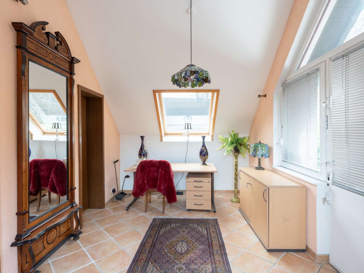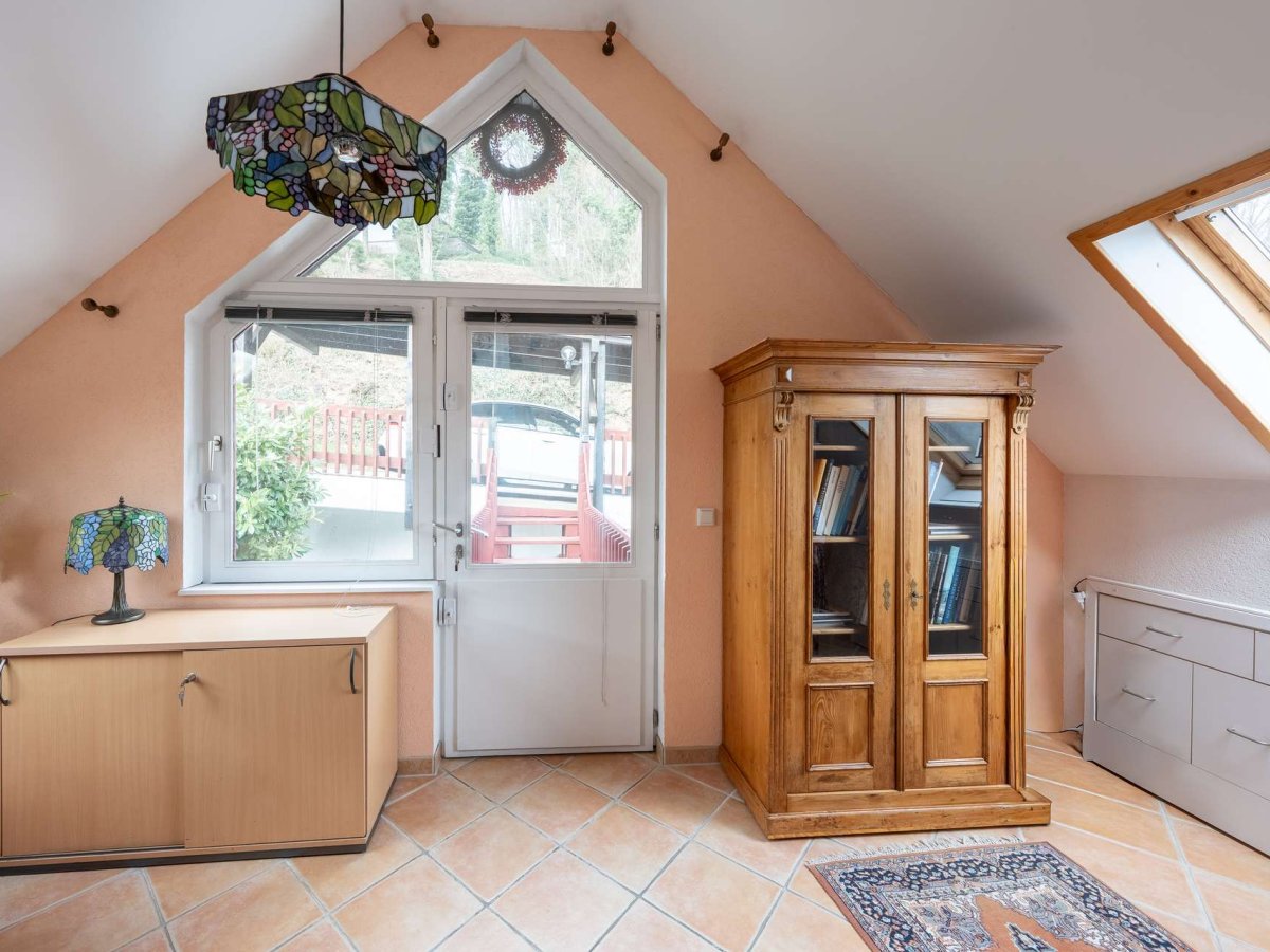 Das Tageslicht-Vollbad überzeugt durch großzügige Abmessungen, während ein Duschbad sowie ein innenliegendes Duschbad den erhöhten Ansprüchen der Familie gerecht werden. Ein Tageslicht-Gäste-WC ergänzt das Raumangebot. Ein begehbarer Kleiderschrank bietet ausreichend Stauraum und ergänzt den durchdachten Grundriss. Über eine Brücke gelangt man separat zum Studiozimmer, was Flexibilität für verschiedene Nutzungen – z. B. als Arbeitszimmer, Atelier oder Gästebereich – ermöglicht. Die Einliegerwohnung besitzt ein großzügiges Zimmer sowie eine herrliche Terrasse mit Strahlenburgblick und erweitert das Nutzungsspektrum um eine eigenständige Wohneinheit oder Büro, ideal für Gäste, Eltern, Au-pair oder Selbstständige, die von zuhause arbeiten.