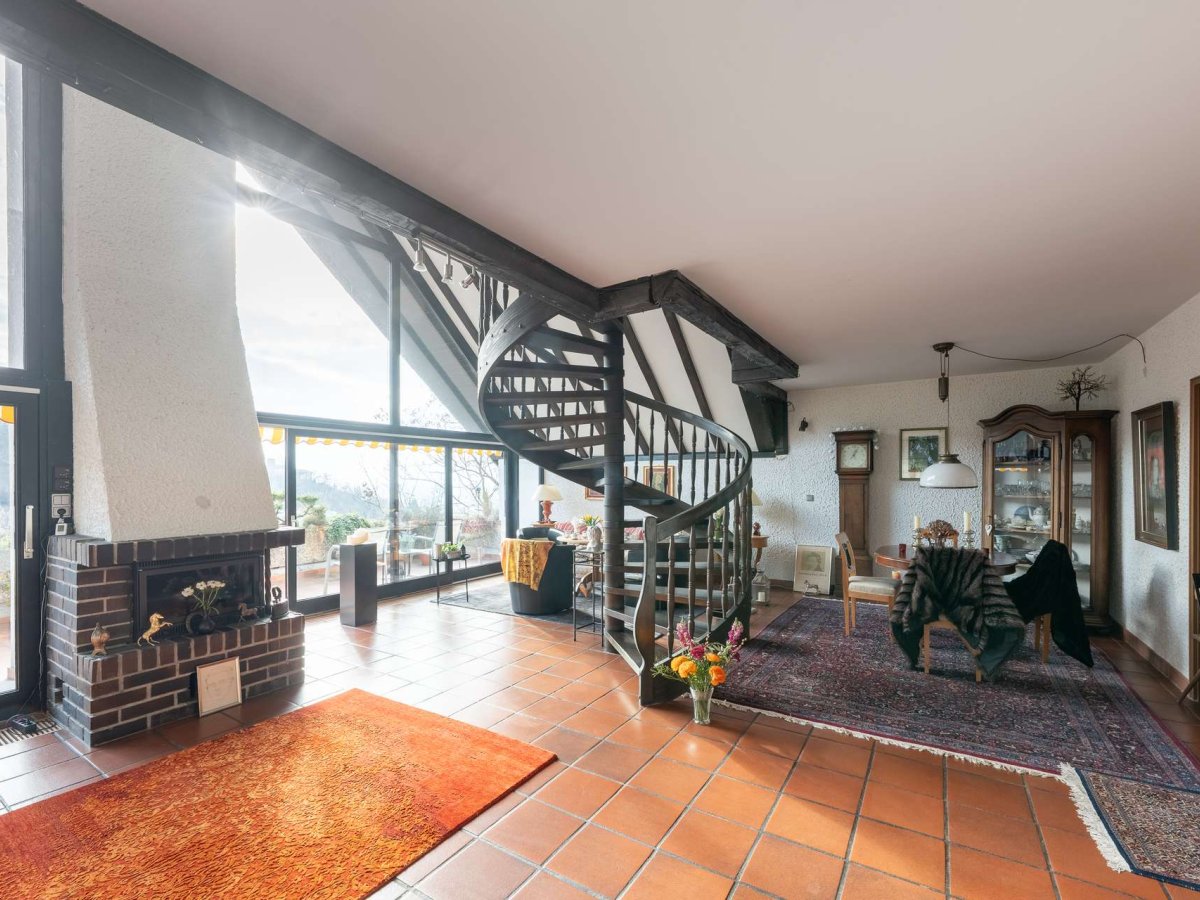 Dieses Architekten-Einfamilienhaus in Schriesheim besticht durch eine einzigartige Hanglage mit Südwest-Ausrichtung und bietet einen spektakulären Blick auf die Strahlenburg sowie über die Rheinebene. Baujahr 1981, die Immobilie besticht durch hervorragende Substanz und großzügige Außenbereiche, die zum Verweilen und Träumen einladen. Durch drei separate Eingänge gelangen Sie in die jeweiligen Wohneinheiten. Über den Haupteingang betreten Sie den offenen Wohn- und Essbereich, der mit einer Raumhöhe von 5,50 Metern ein beeindruckendes Gefühl von Großzügigkeit vermittelt. Ein Kamin sorgt an kühlen Abenden für behagliche Wärme, während eine einladende Kaffeebar im Wohn- und Kochbereich Atmosphäre und Funktionalität vereint.