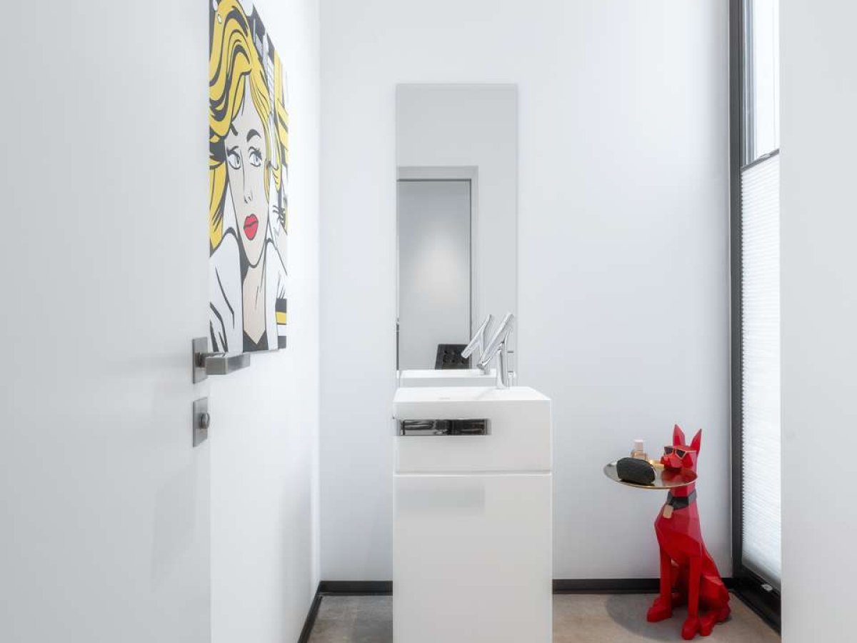 Im Erdgeschoss befindet sich ein Gäste-WC. Des Weiteren stehen zwei moderne Bäder zur Verfügung, ergänzt durch ein Ankleidezimmer, das direkt an die Master-Suite anschließt. Eine hochwertige Einbauküche der Marke Gaggenau, ausgestattet mit erstklassigen Arbeitsbereichen und Elektrogeräten, fügt sich nahtlos in das offene Wohn-Konzept mit Kamin ein. Großzügige, lichtdurchflutete Räume dank großzügiger Verglasung schaffen ein helles, einladendes Ambiente, von hier gelangen Sie direkt auf eine der Terrassen.