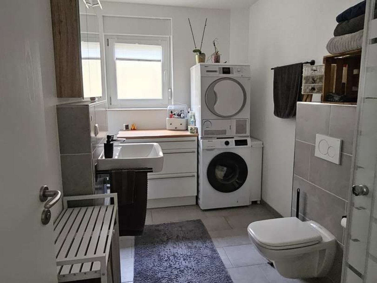 Das modern ausgestattete Badezimmer bietet höchsten Komfort: Neben einem Doppelwaschtisch stehen eine Badewanne sowie eine großzügige, bodengleiche Dusche zur Verfügung. Hier gibt es die Möglichkeit Waschmaschine und Trockner anzuschließen.